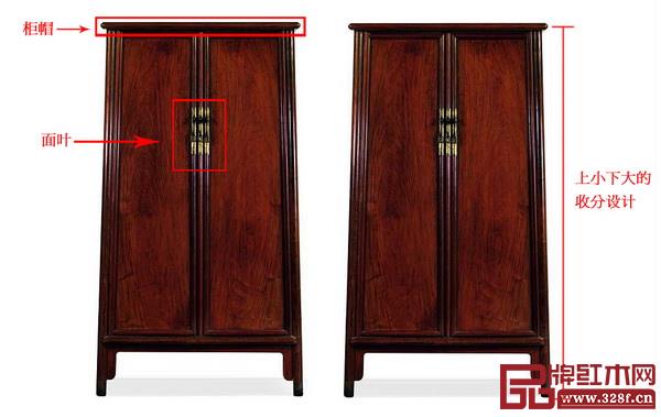 方角柜,基本造型与圆角柜相同,不同之处在于柜体垂直,上下同大,四条腿也是方材,柜门等采用合页结合。